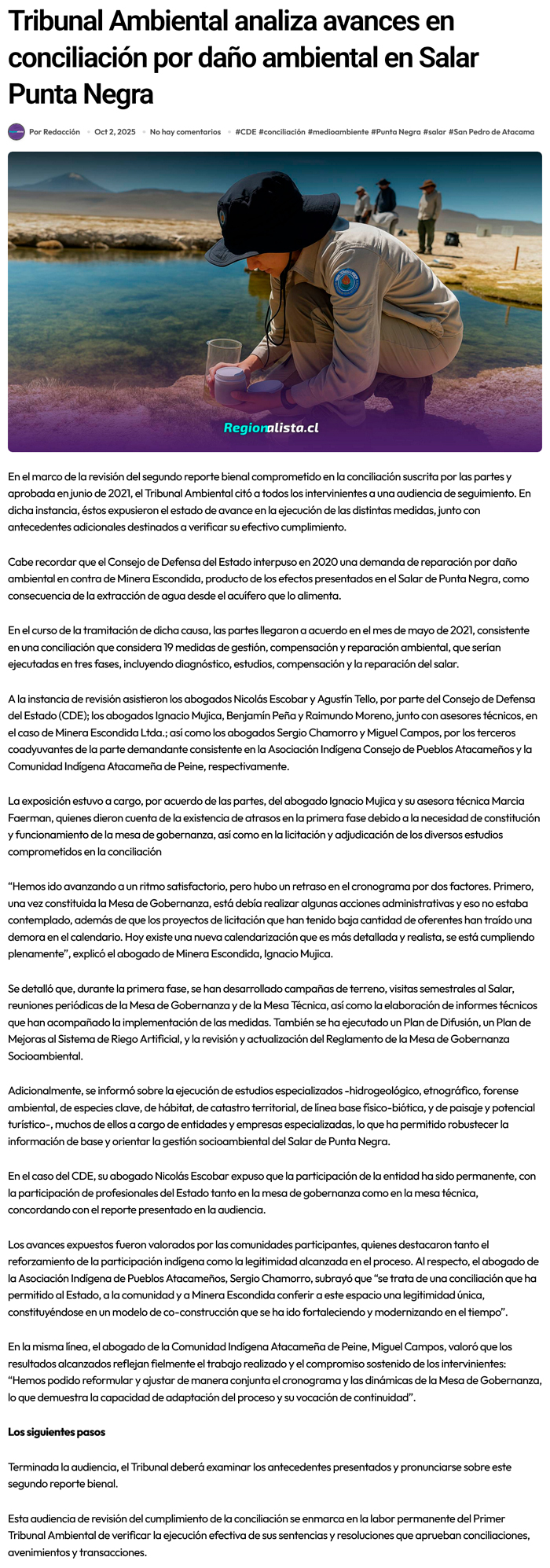 1TA revisa avance de conciliación por daño ambiental en Salar Punta Negra - (El Mercurio de Calama)