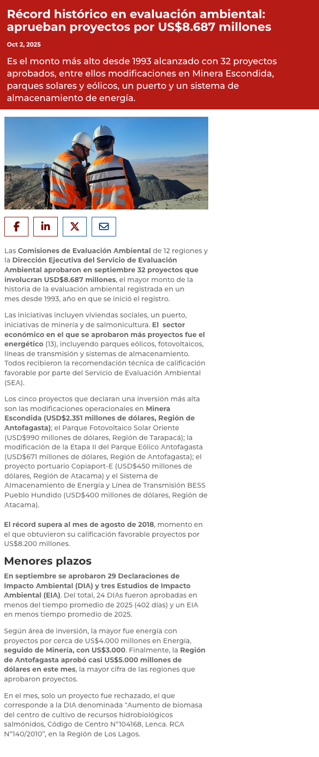 Chile alcanza récord histórico de inversión aprobada en evaluación ambiental: US$8.687 millones en septiembre - (puranoticia.cl)