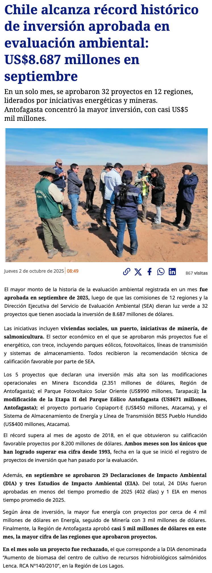 Septiembre marca récord mensual en aprobación ambiental de proyectos: 32 iniciativas por US$8.687 millones - (CNN Chile)