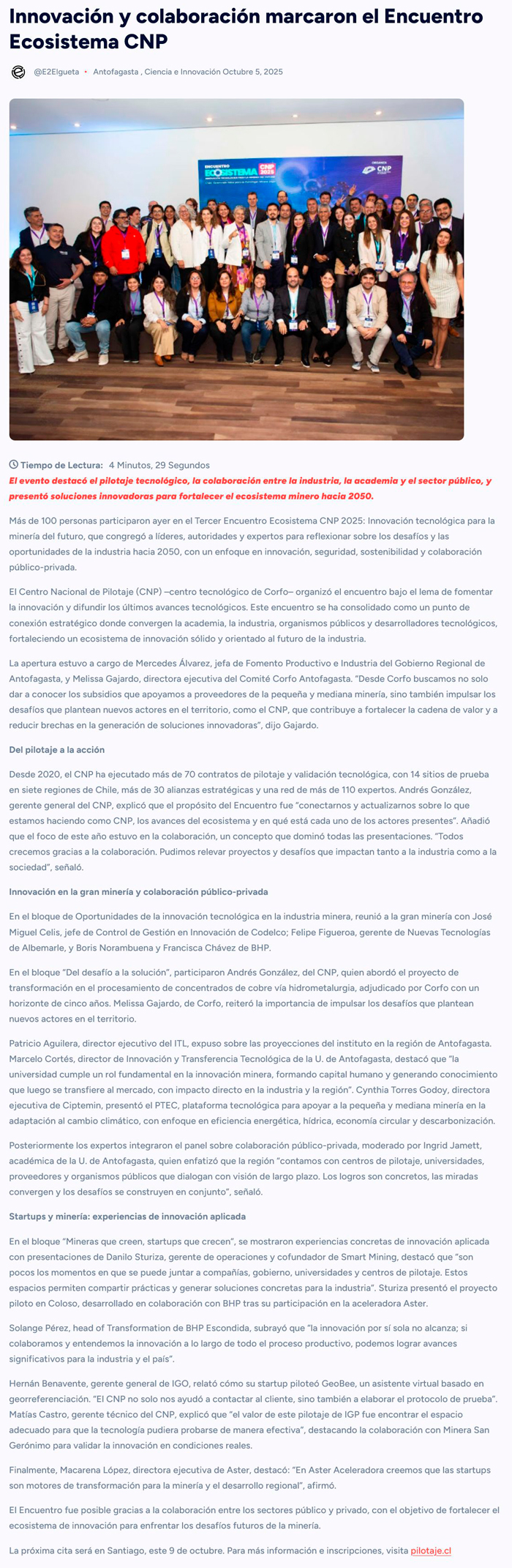 Líderes y expertos se reúnen por la minería del futuro: Innovación y colaboración marcaron el Encuentro Ecosistema CNP en Antofagasta - (regionesnoticias.cl)