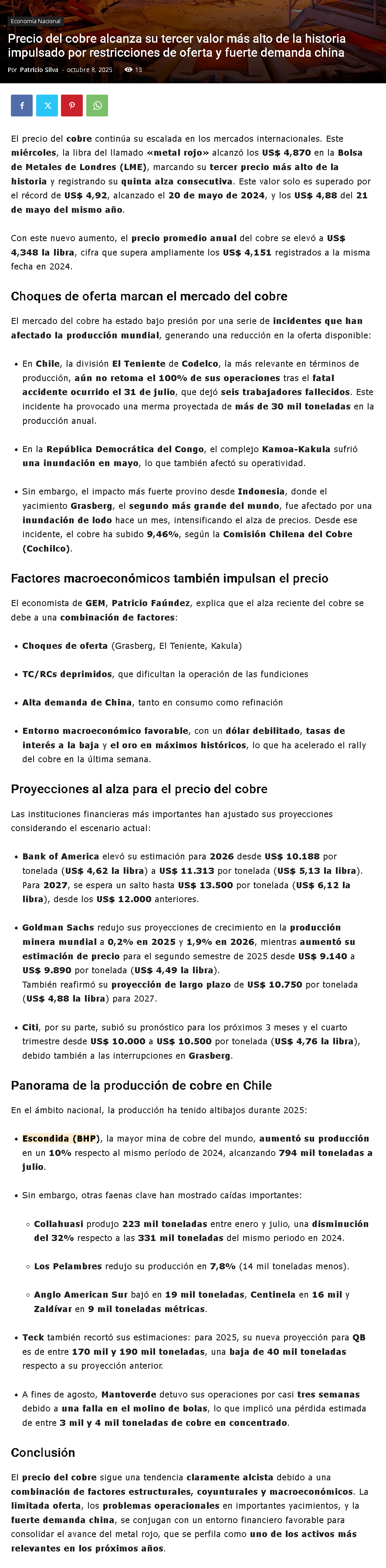 El cobre no detiene su escalada y alcanza su tercer nivel nominal más alto de la historia - (Pulso)