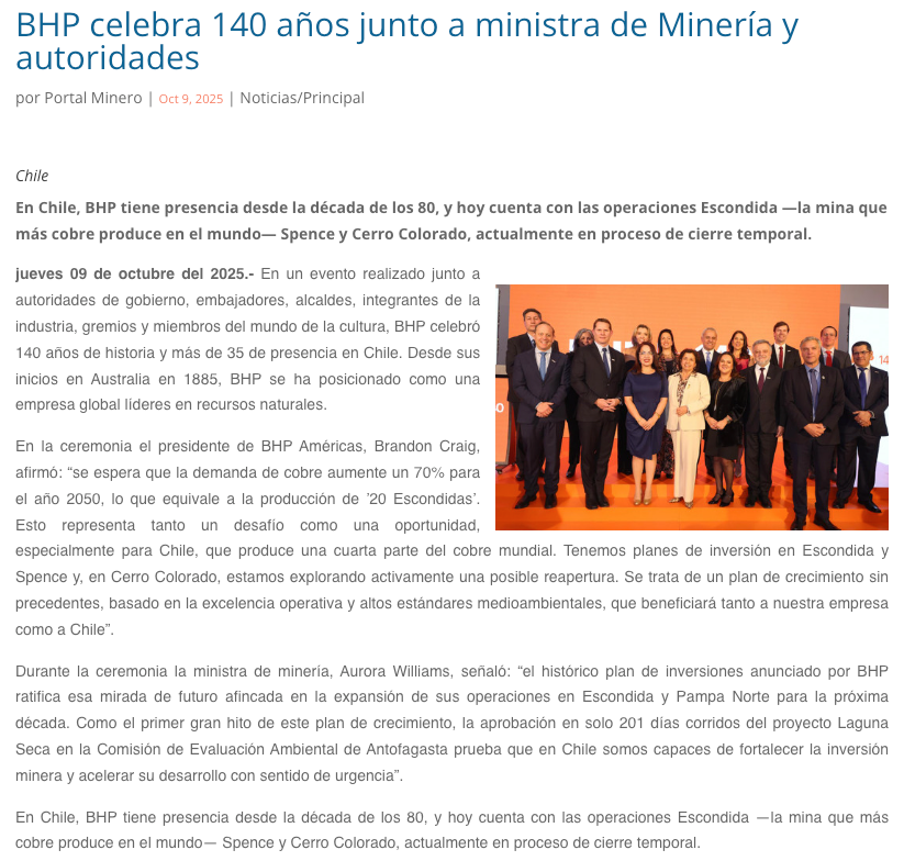 BHP celebra 140 años: «Tenemos planes de inversión en Escondida y Spence» - (minerialocal.cl)