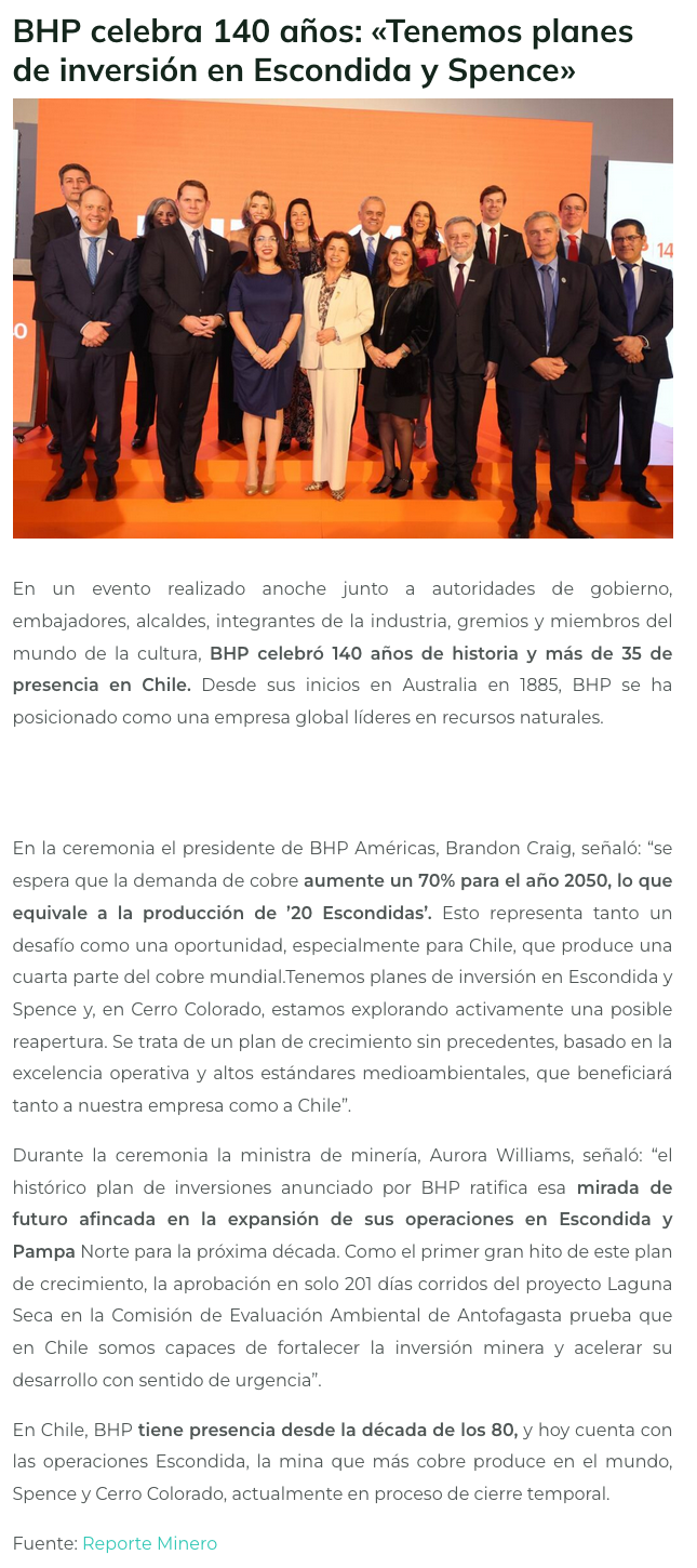BHP celebra 140 años: "Tenemos planes de inversión en Escondida y Spence" - (reporteminero)