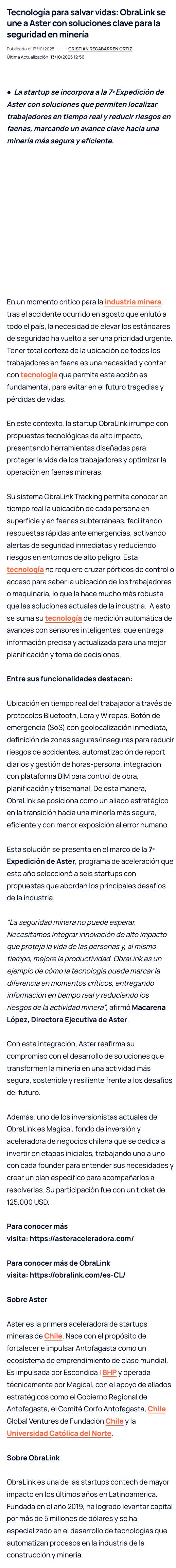 Tecnología para salvar vidas: ObraLink se une a Aster con soluciones clave para la seguridad en minería - (portalinnova.cl)