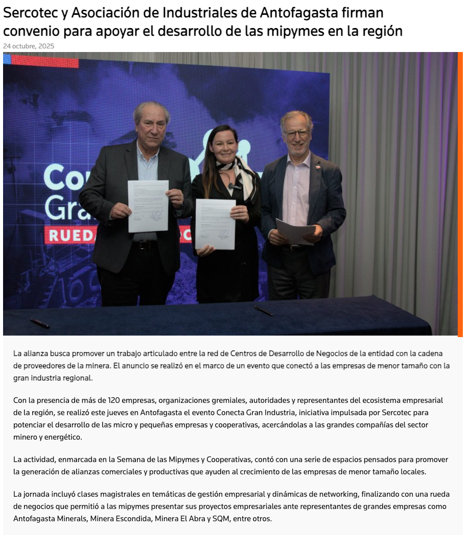 Sercotec y Asociación de Industriales de Antofagasta firman convenio para apoyar el desarrollo de las mipymes - (portalinnova.cl)