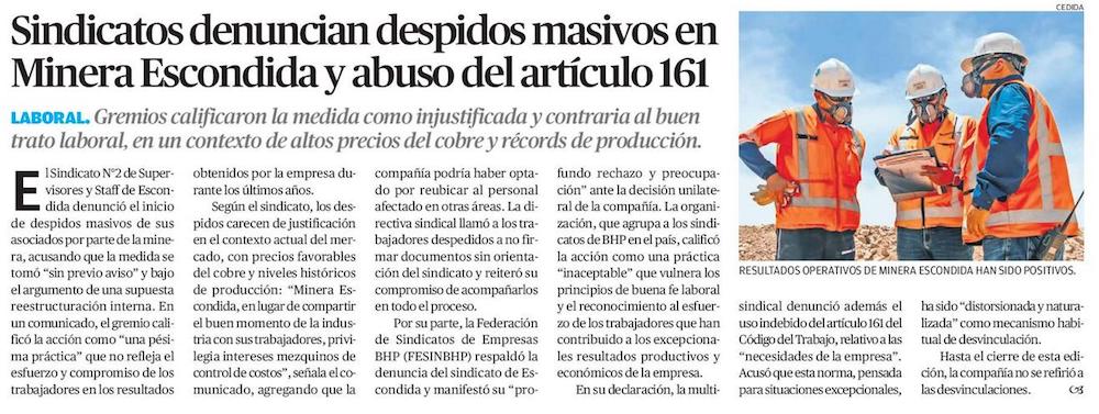 Sindicatos denuncian despidos masivos en Minera Escondida y abuso del artículo 161 - (El Mercurio de Antofagasta)