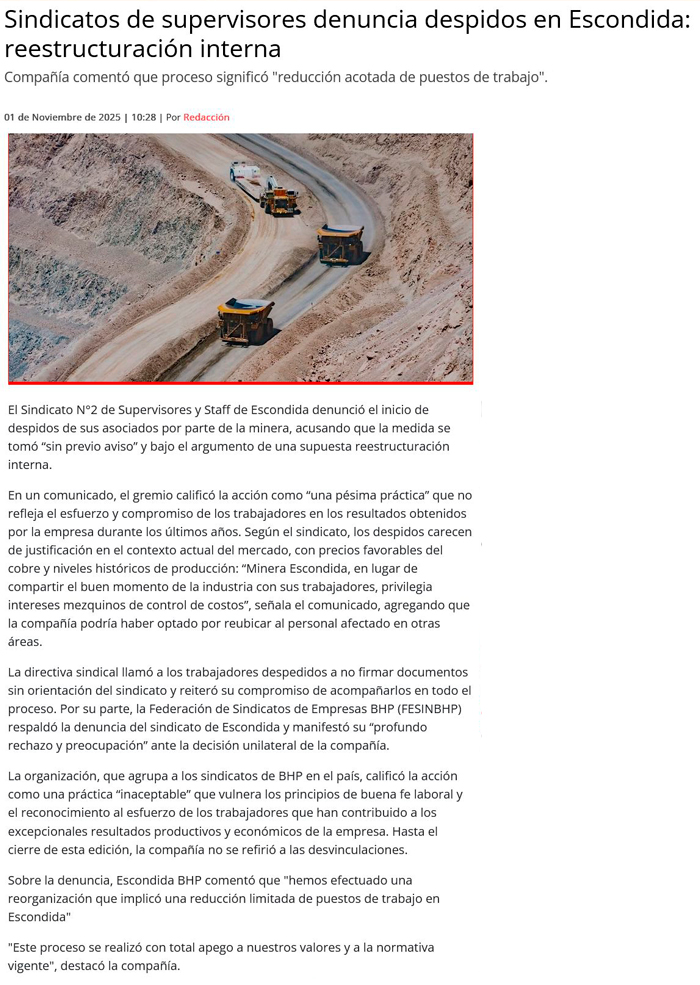 Sindicatos denuncian despidos masivos en Minera Escondida y abuso del artículo 161 - (El Mercurio de Antofagasta)