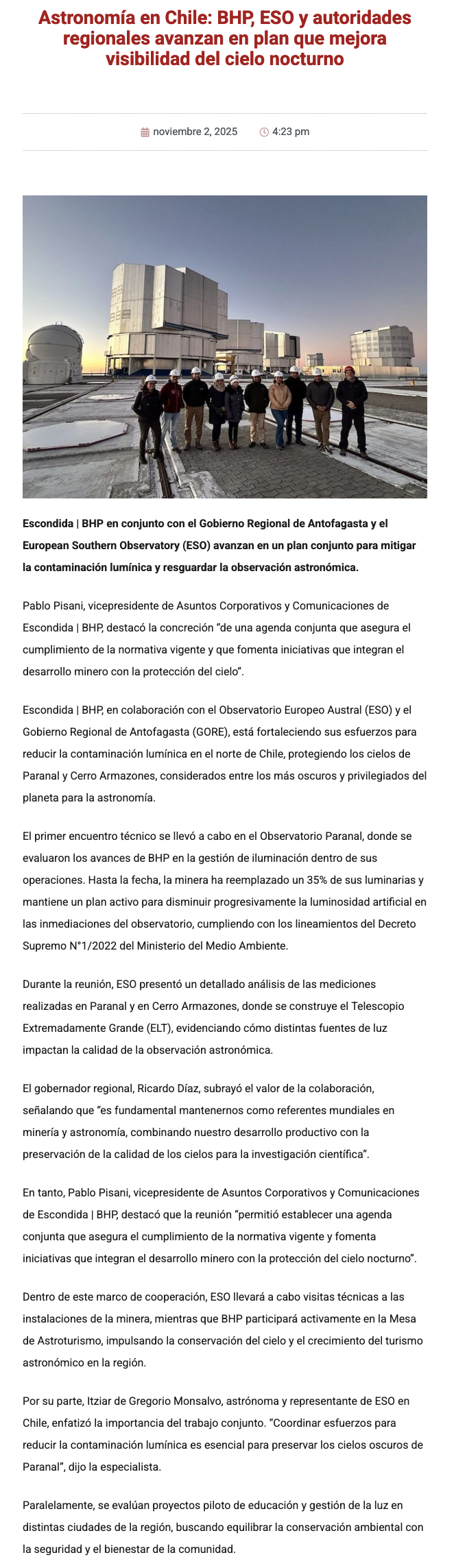 Astronomía en Chile: BHP, ESO y autoridades regionales avanzan en plan que mejora visibilidad del cielo nocturno - (g5noticias.cl)