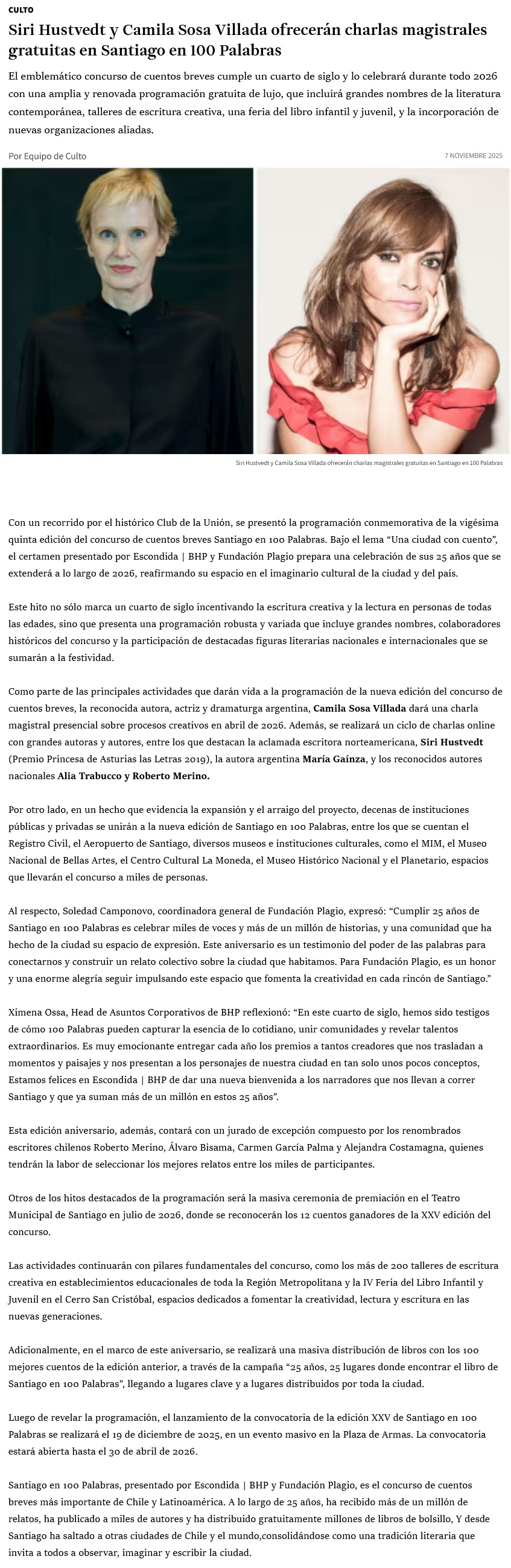 Siri Hustvedt y Camila Sosa, las charlas magistrales gratuitas que destacarán en Santiago en 100 palabras - (24horas.cl)