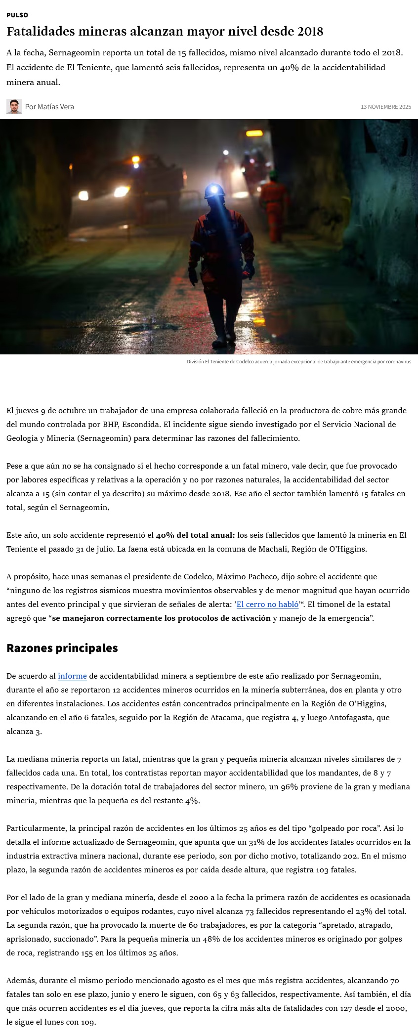 Fatalidades mineras en Chile alcanzan su nivel más alto desde 2018: Sernageomin reporta 15 fallecidos en lo que va del año - (redimin)