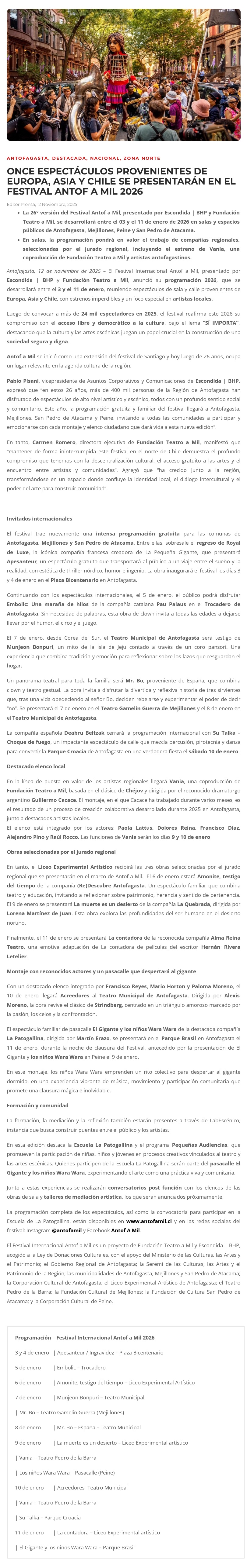 Once espectáculos provenientes de Europa, Asia y Chile se presentarán en el Festival Antofa a Mil 2026 - (timeline)