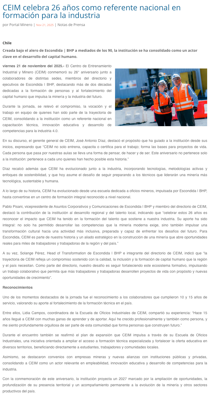 CEIM celebra 26 años como referente nacional en formación para la industria - (norteonline.cl)