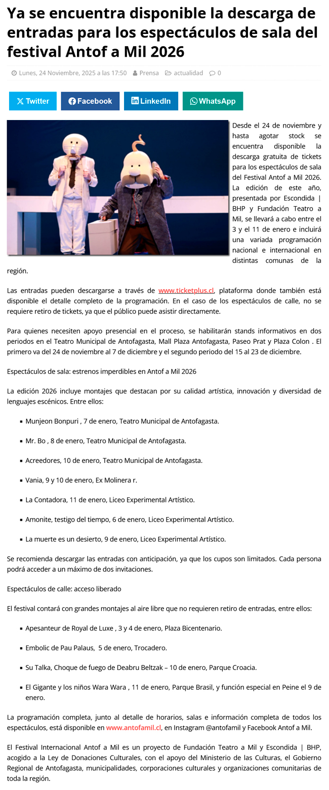 Ya se encuentra disponible la descarga de entradas para los espectáculos de sala del festival Antof a Mil 2026 - (antofagastanoticias)