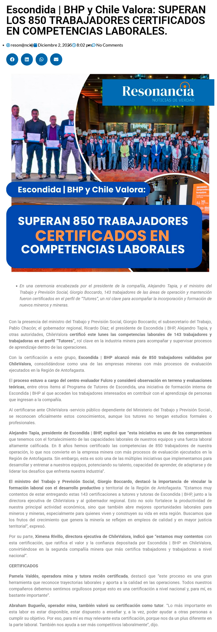 Escondida | BHP y ChileValora superan los 850 trabajadores certificados en competencias laborales en la región de Antofagasta - (madero.cl)