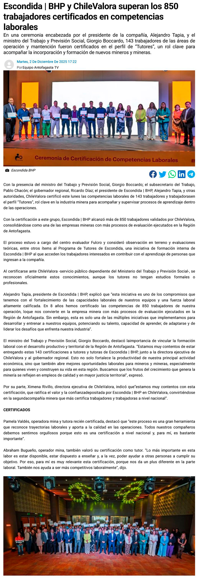 Escondida | BHP y Chile Valora: superan los 850 trabajadores certificados en competencias laborales - (resonanciadiario.cl)
