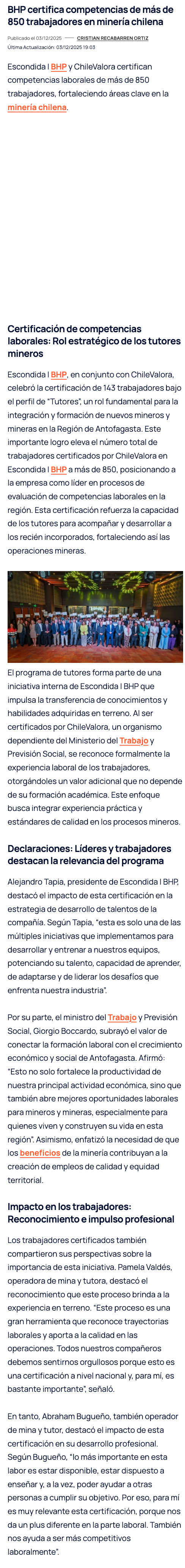 Escondida | BHP y ChileValora superan los 850 trabajadores certificados en competencias laborales - (mch.cl)