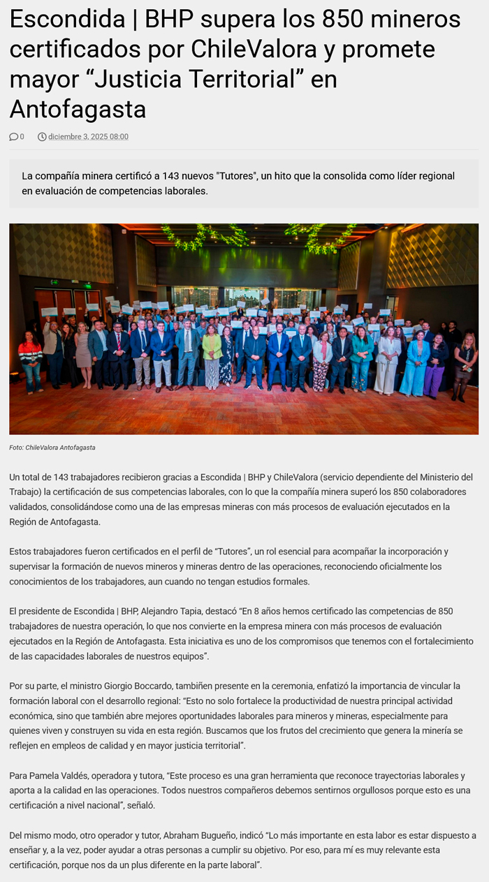 Escondida | BHP alcanza récord regional con más de 850 trabajadores certificados por ChileValora - (regionalista.cl)