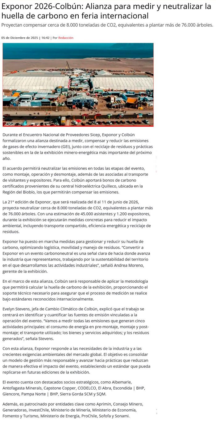 EXPONOR y Colbún sellan alianza para medir y neutralizar la huella de carbono en la exhibición minera de 2026 - (mineriayfuturo.cl)