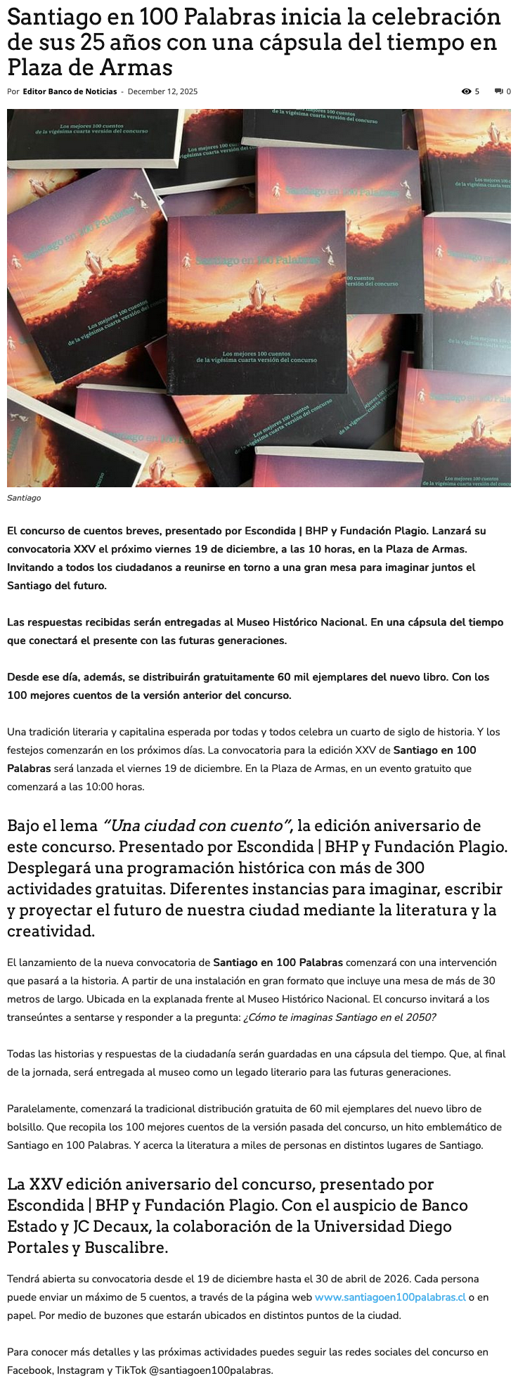 Santiago en 100 palabras inicia la celebración de sus 25 años con una cápsula del tiempo en Plaza de Armas - (presslatam.cl)