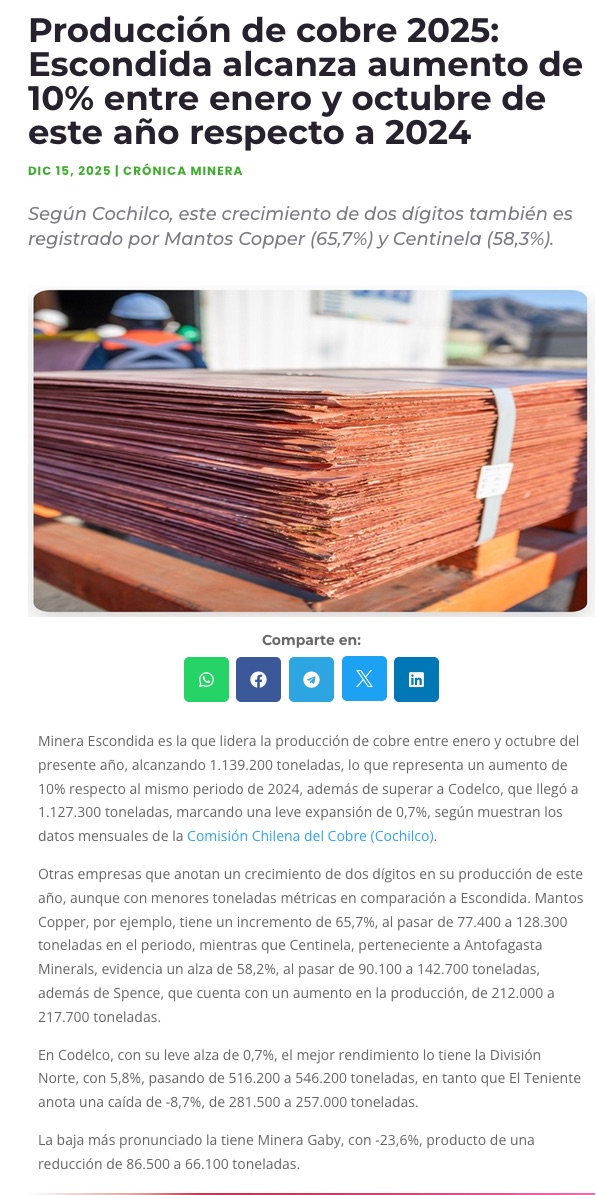 Escondida produce en 2025 por primera vez más cobre que Codelco - (Pulso)