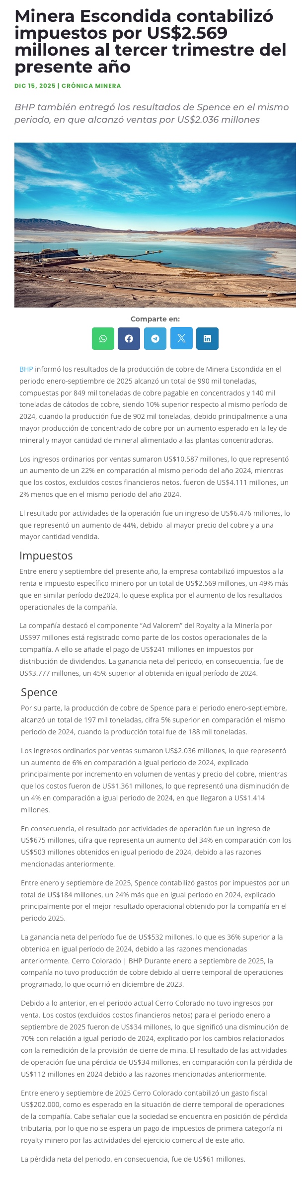 Resultados enero – septiembre 2025: Escondida contabilizó impuestos por US$2.569 millones - (redimin)