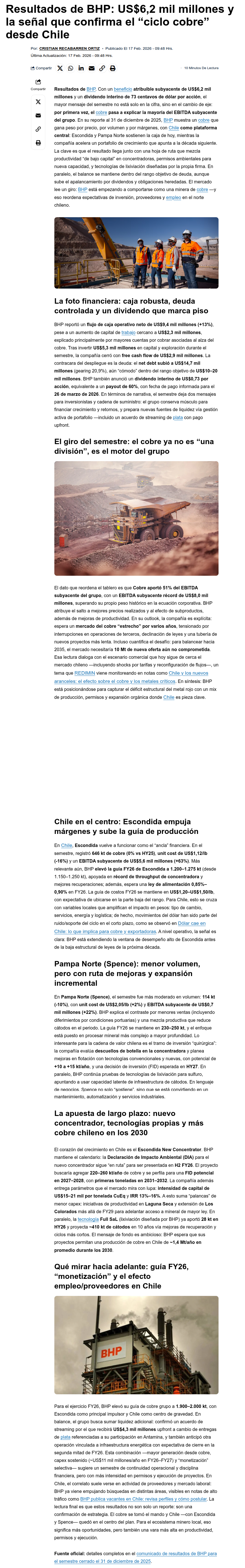 BHP reporta crecimiento en utilidades y mejora perspectivas para Escondida - (mineriayfuturo.cl)