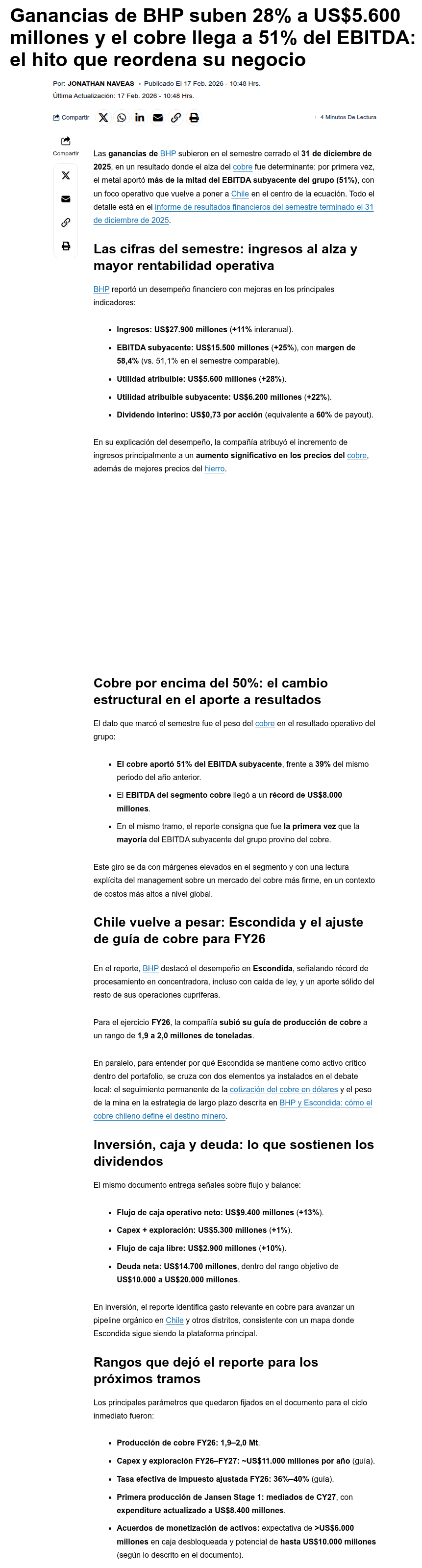 Resultados de BHP: US$6,2 mil millones y la señal que confirma el “ciclo cobre” desde Chile - (redimin)