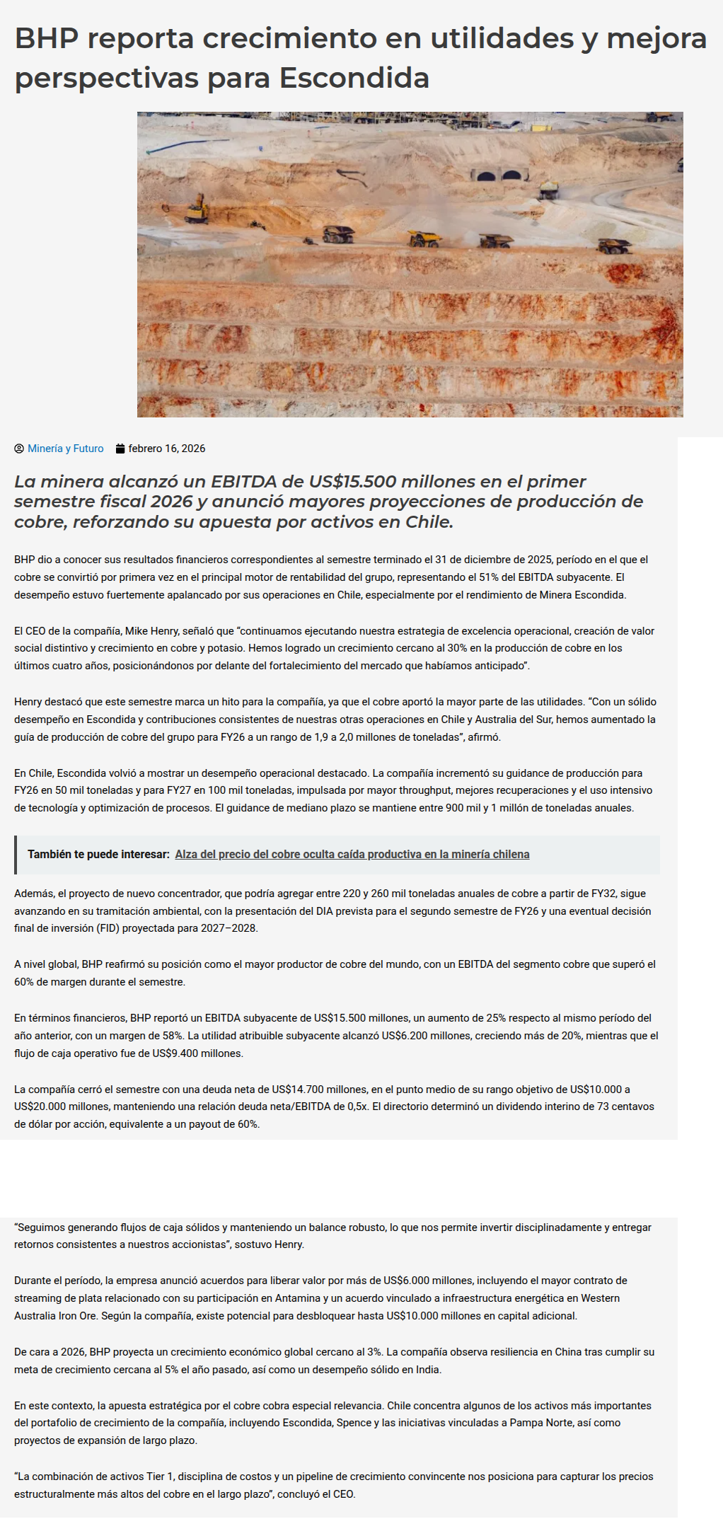 BHP Group eleva 28% sus utilidades en el primer semestre fiscal 2026 impulsada por el cobre - (electromineria)