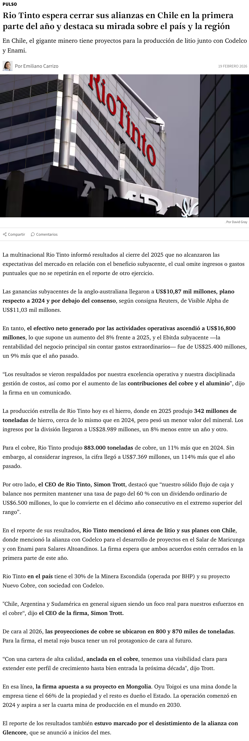Rio Tinto proyecta cerrar alianzas en Chile en el primer semestre y reporta US$10,87 mil millones en utilidades subyacentes - (redimin)