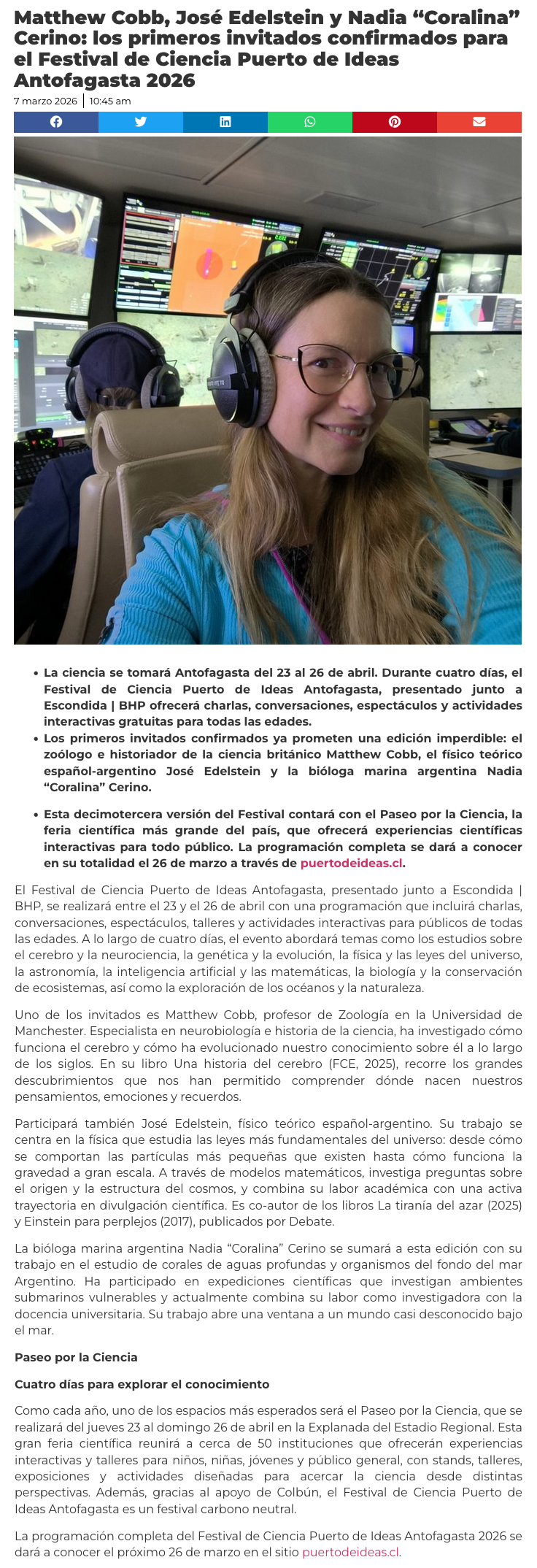 Matthew Cobb, José Edelstein y Nadia “Coralina” Cerino: los primeros invitados confirmados para el Festival de Ciencia Puerto de Ideas Antofagasta 2026 - (antofagastanoticias)