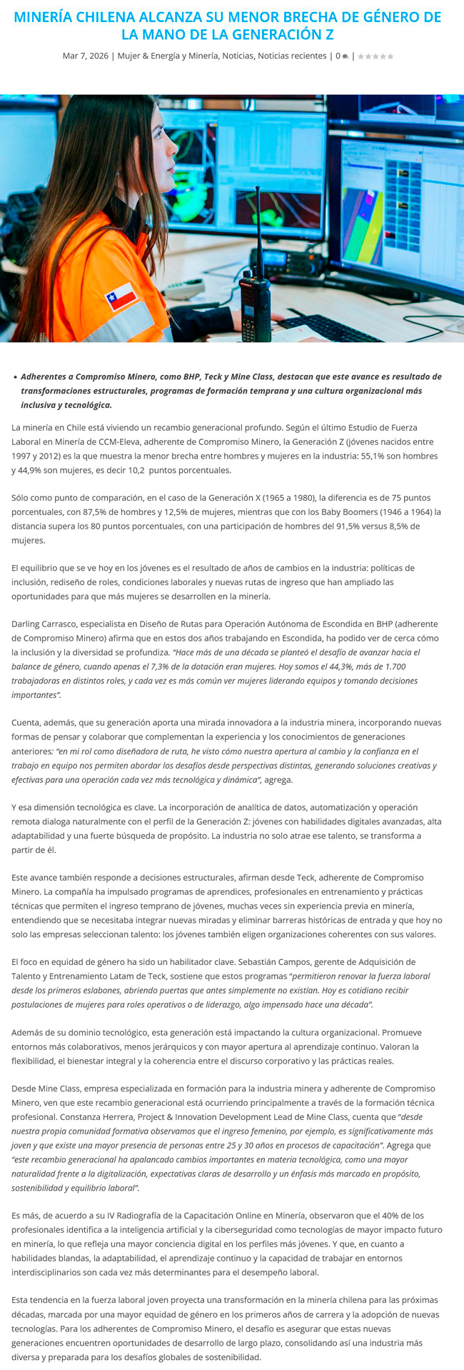 Generación Z impulsa la menor brecha de género registrada en la minería chilena - (mineriayfuturo.cl)
