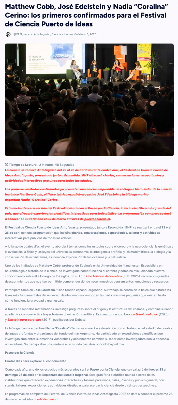 Matthew Cobb, José Edelstein y Nadia “Coralina” Cerino: los primeros invitados confirmados para el Festival de Ciencia Puerto de Ideas Antofagasta 2026 - (antofagastanoticias)