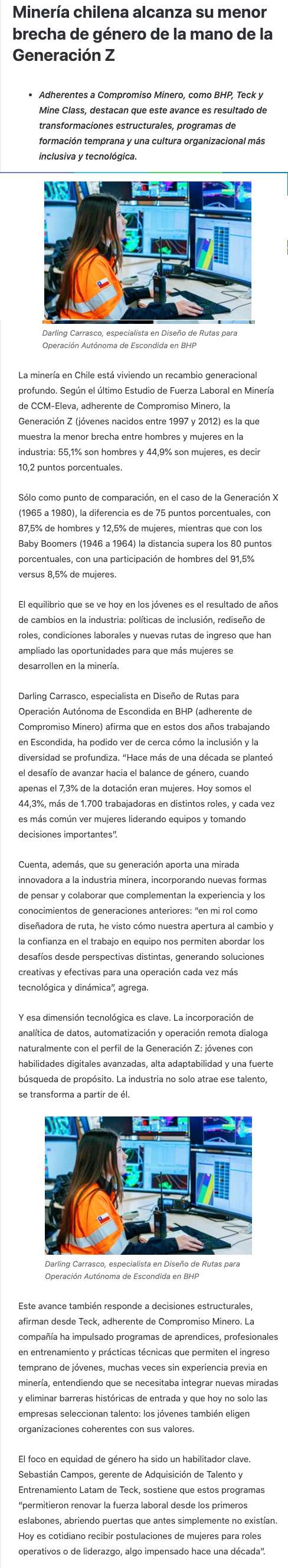 Minería chilena alcanza su menor brecha de género de la mano de la Generación Z - (norteyenegia.cl)