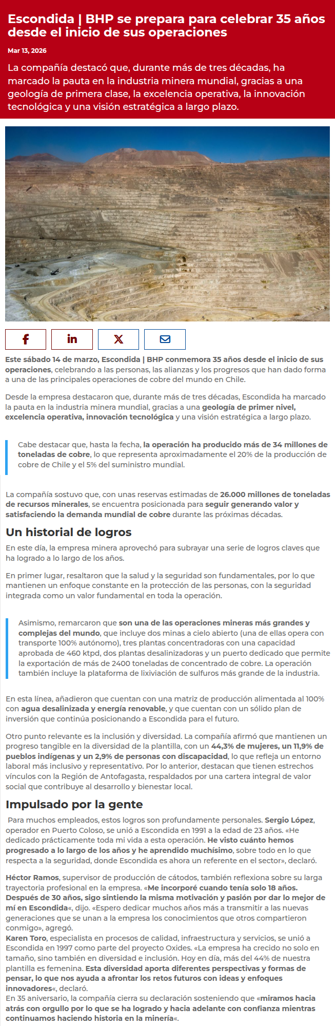 Escondida | BHP conmemora 35 años liderando la minería chilena y global desde la Región de Antofagasta - (diarioantofagasta)