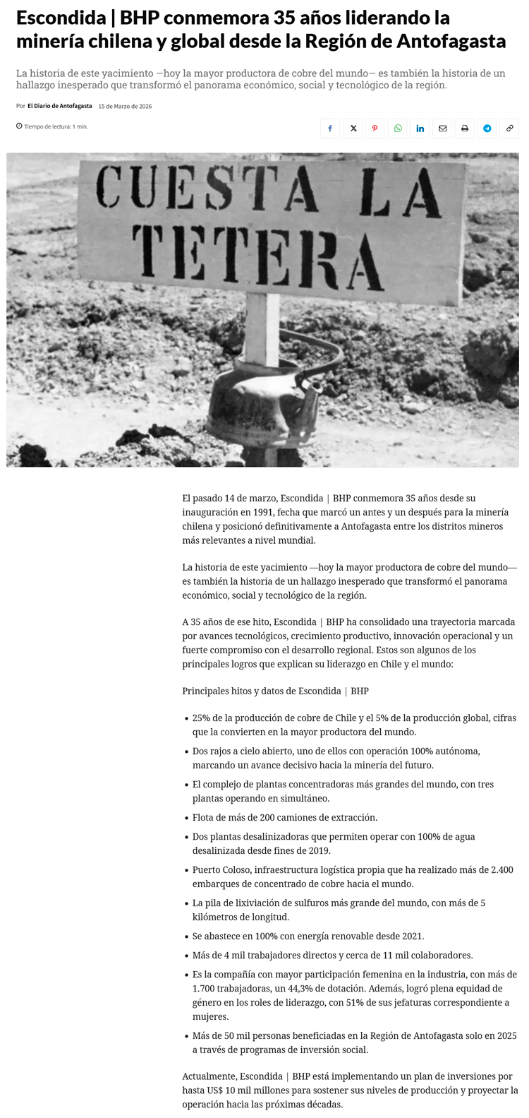 Escondida | BHP celebra 35 años: la historia de cómo nació la mayor productora global de cobre - (El Mercurio de Antofagasta)