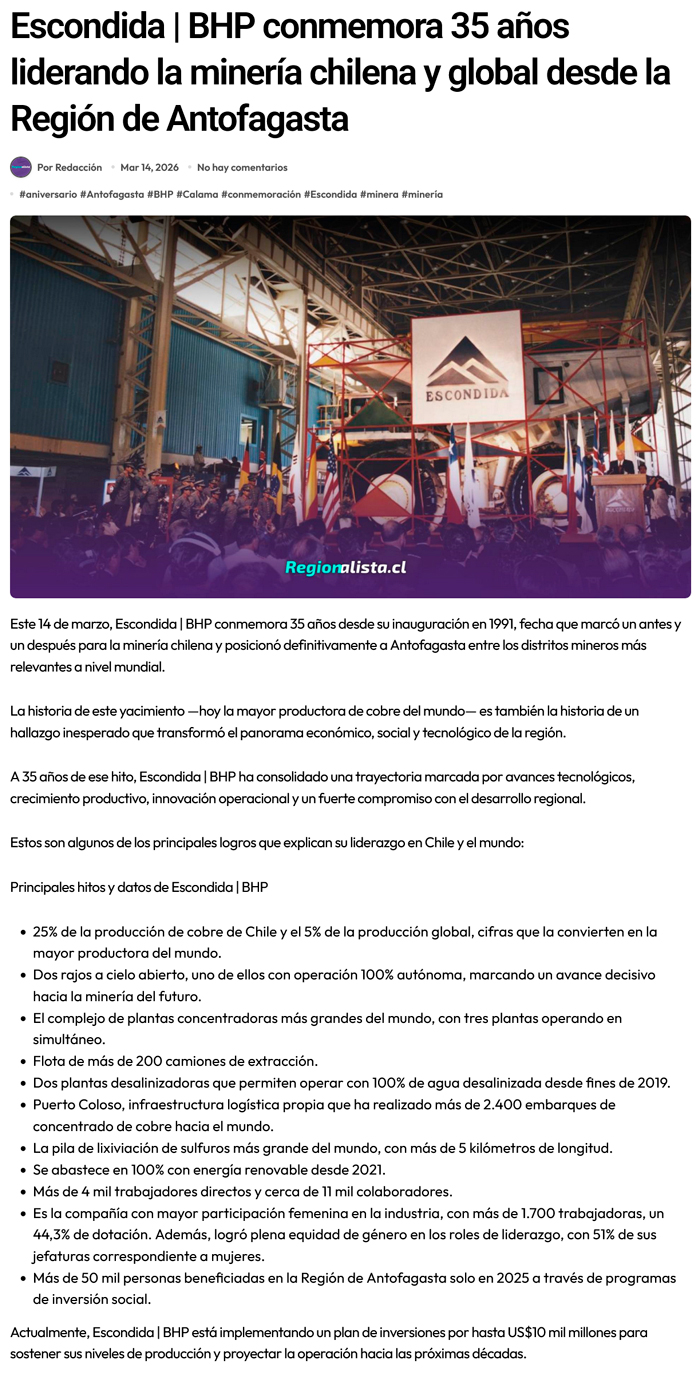 Escondida | BHP conmemora 35 años liderando la minería chilena y global desde la Región de Antofagasta - (diarioantofagasta)
