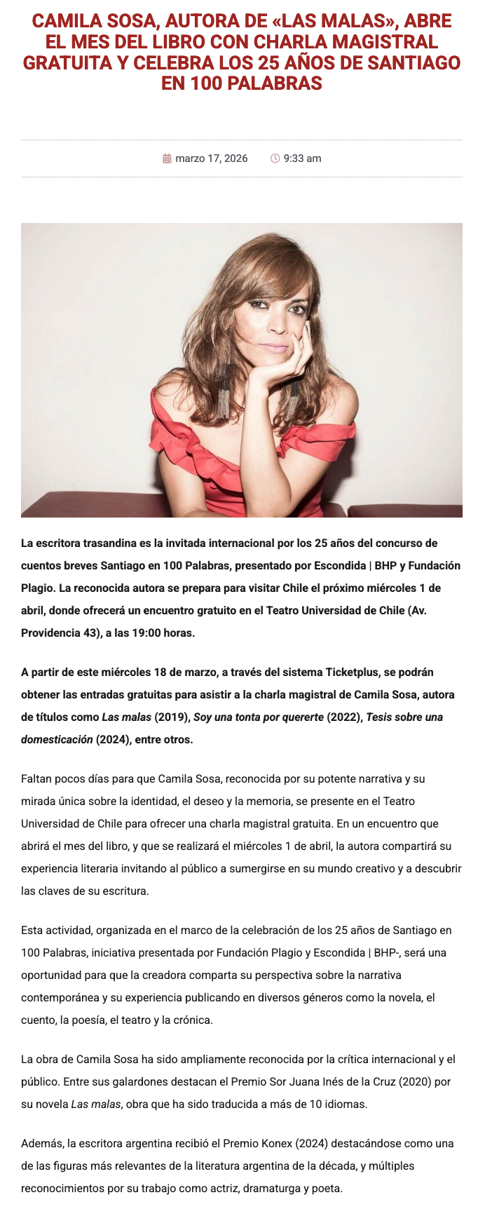 Santiago en 100 Palabras: Camila Sosa, autora de "Las Malas" abre el Mes del Libro con charla magistral gratuita - (lahora.cl)