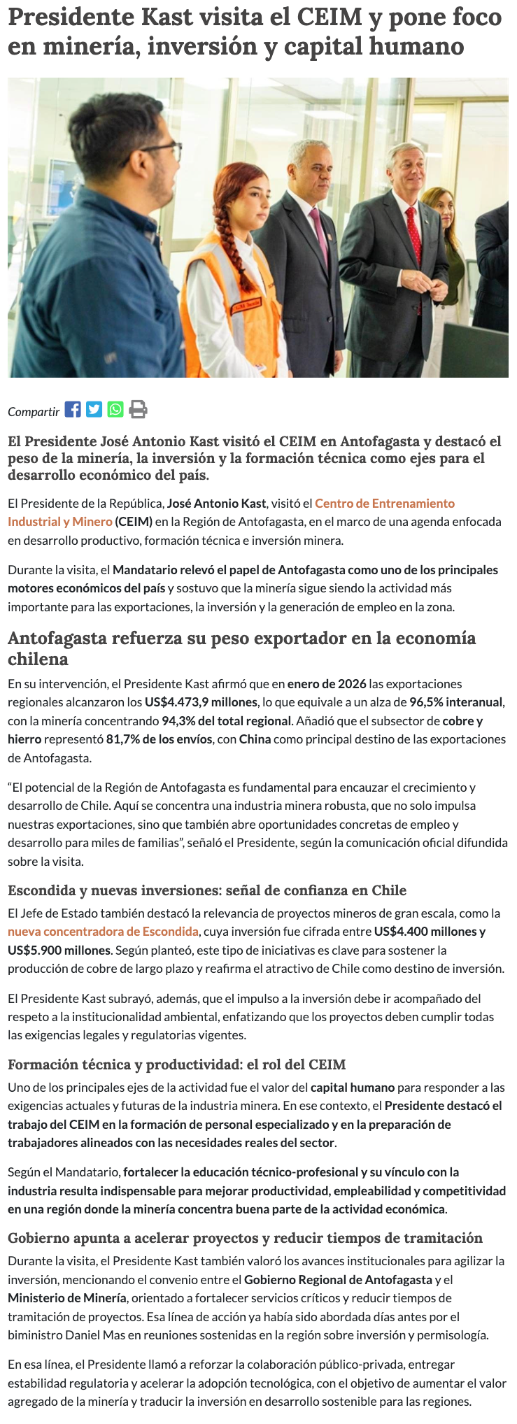 Presidente Kast visita CEIM Antofagasta y destaca anuncio de inversión de US$5.000 millones de Escondida BHP - (madero.cl)