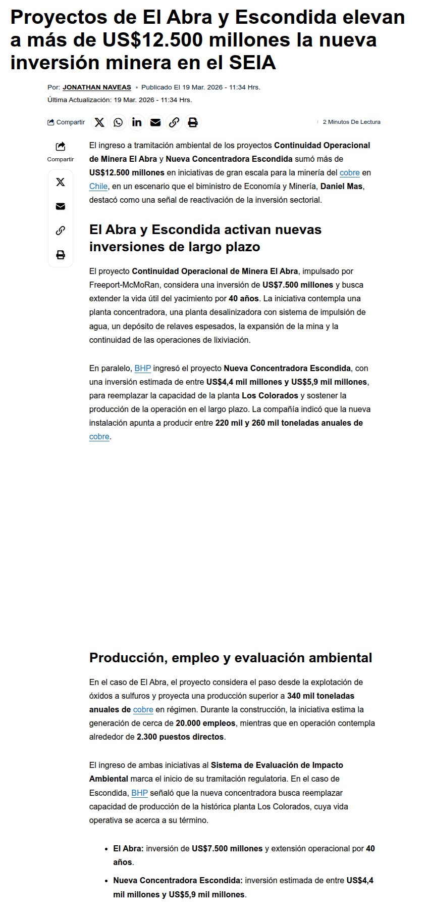 El Abra, Escondida y posiblemente Collahuasi impulsan un auge de la inversión minera - (El Mercurio de Santiago)