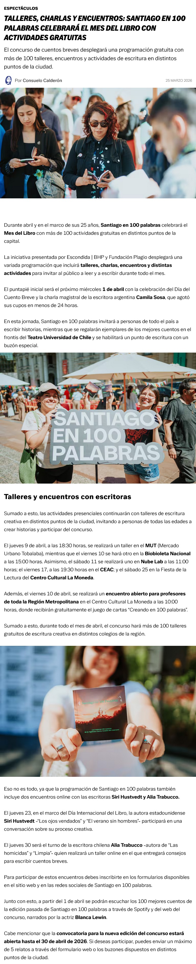 Con más de 100 actividades: Santiago en 100 Palabras celebra el Mes del Libro con talleres, encuentros y el estreno de audiolibro - (radioagricultura.cl)