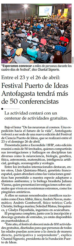 "De las neuronas al cosmos": más de 100 actividades gratuitas darán vida al Festival Puerto de Ideas - (El Mercurio de Antofagasta)