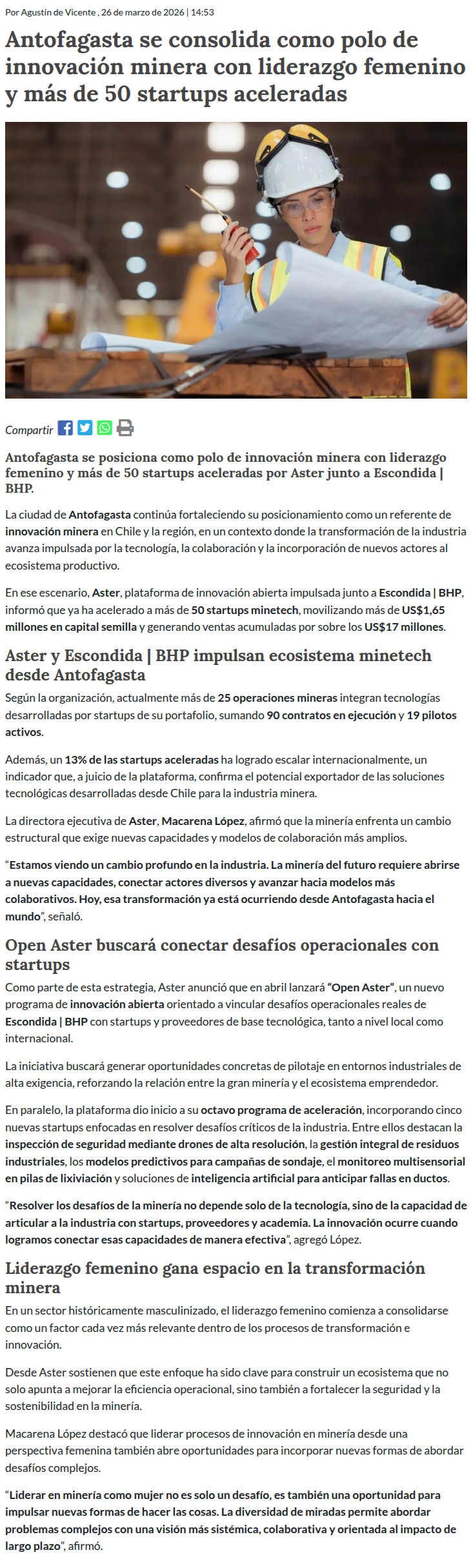Antofagasta se posiciona como polo de innovación minera con liderazgo femenino y más de 50 startups aceleradas - (portalinnova.cl)