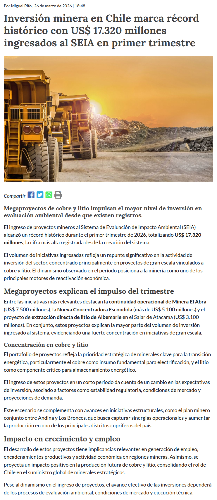 Inversión minera en Chile marca récord histórico: proyectos por US$ 17.320 millones ingresan al SEIA en primer trimestre - (reporteminero)