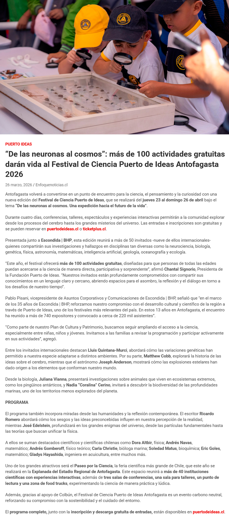 “De las neuronas al cosmos”: más de 100 actividades gratuitas darán vida al Festival de Ciencia Puerto de Ideas Antofagasta 2026 - (cpcomunicaciones.cl)