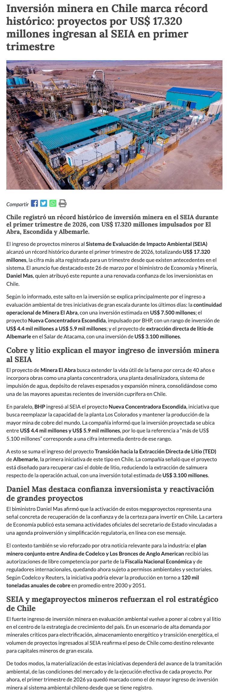 Inversión minera en Chile marca récord histórico con US$ 17.320 millones ingresados al SEIA en primer trimestre - (reporteminero)