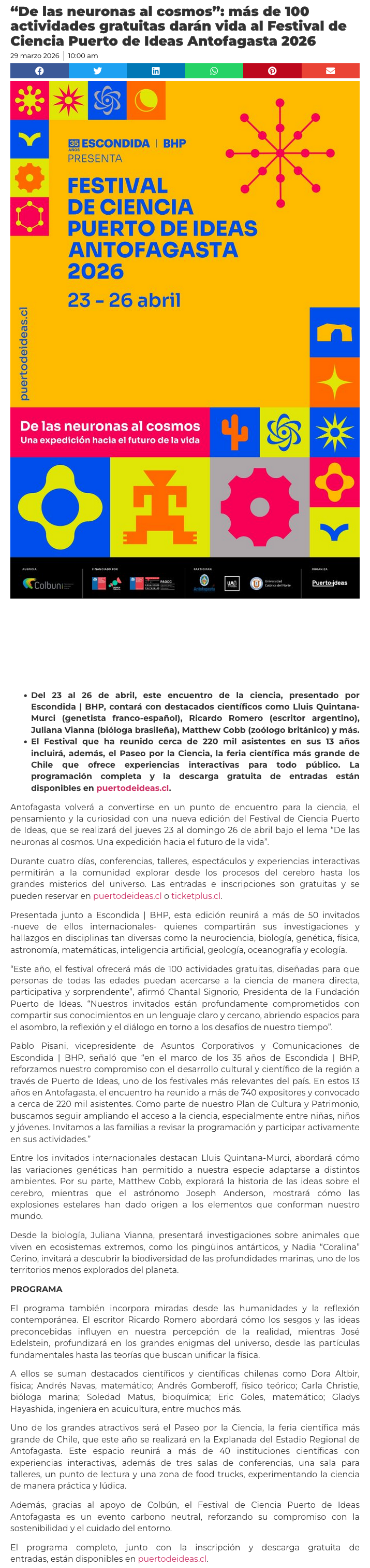 “De las neuronas al cosmos”: más de 100 actividades gratuitas darán vida al Festival de Ciencia Puerto de Ideas Antofagasta 2026 - (norte360.cl)