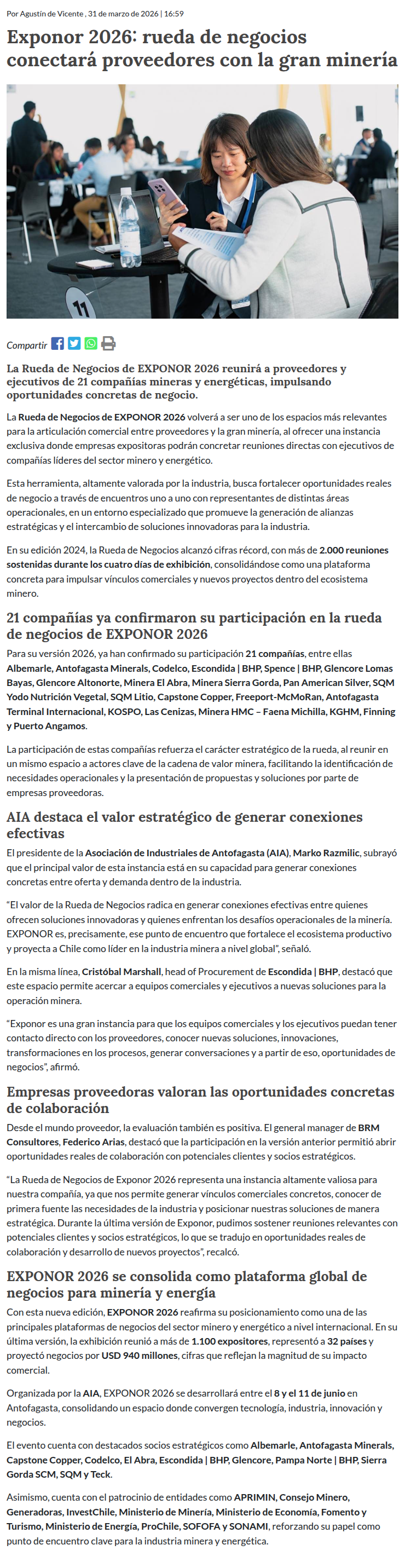 Exponor 2026: Rueda de Negocios vincula proveedores con la gran minería - (antofagastanoticias)