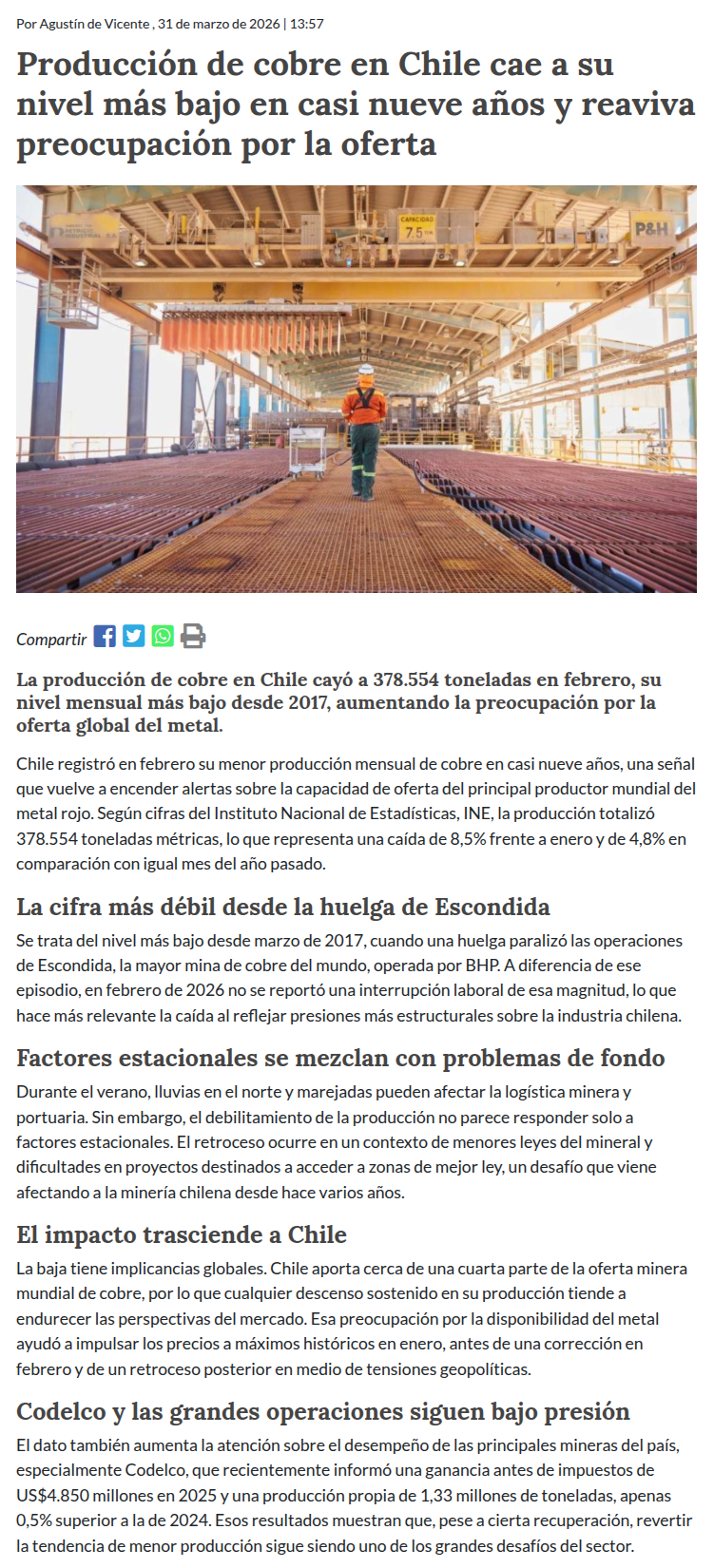 Producción de cobre en Chile cayó en febrero y volvió a tensionar la oferta del mercado - (redimin)