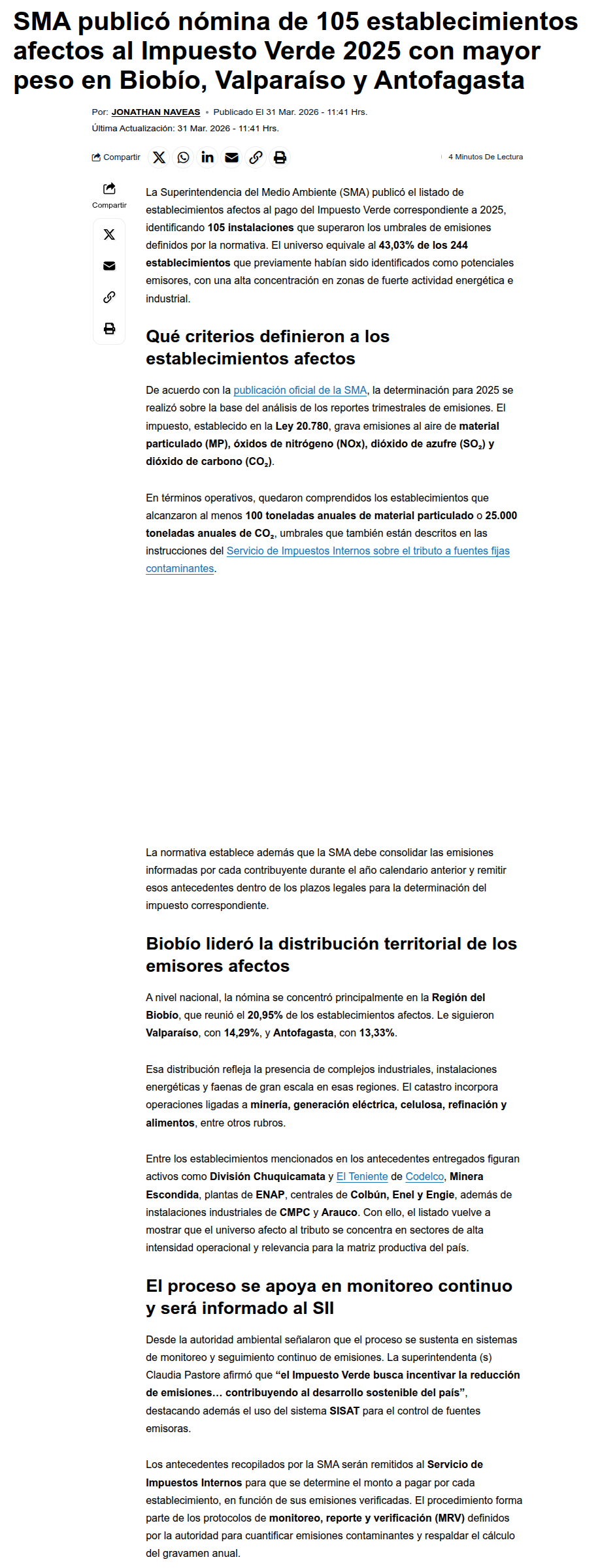 SMA identifica 105 establecimientos afectos al Impuesto Verde 2025 con foco en energía e industria - (reporteminero)