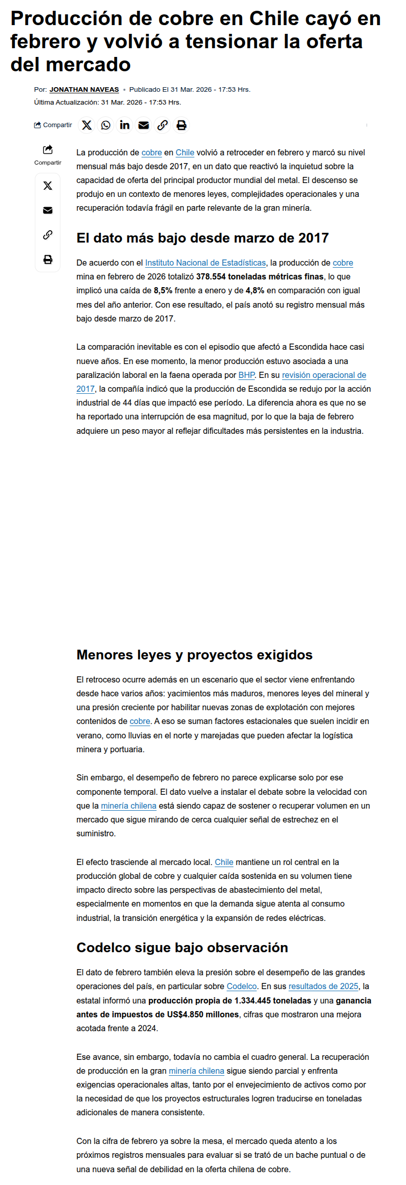 Producción de cobre en Chile toca su nivel más bajo en casi nueve años aumentando la preocupación por el suministro - (emol)